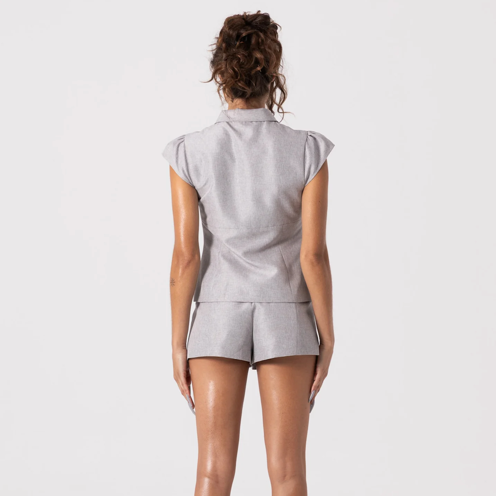 Cut from textured suiting, the Blair Suit Shirt sits clean and structured with gathered cap sleeves and a discreet double-ended silver zip.