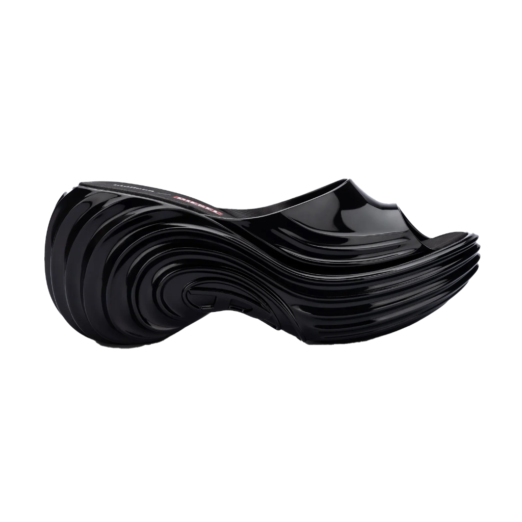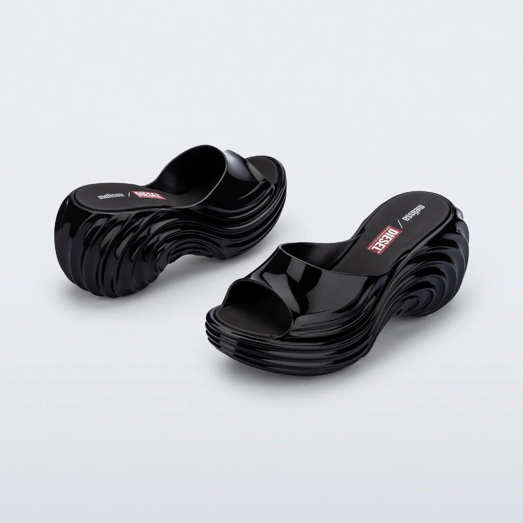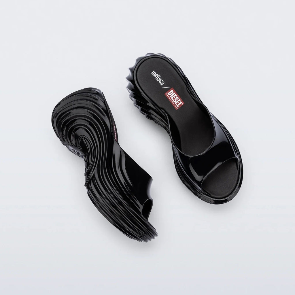 The Melissa Quantum Platform + Diesel is a fusion of innovation and digital brutalism, bringing parametric design references into fashion. With a full one-piece PVC structure, the shoe features a fluid, futuristic aesthetic marked by sculptural waves that create a dynamic visual effect. The chunky platform adds presence and impact, while the molded EVA insole ensures comfort. The full PVC upper is seamlessly glued to the sole, creating a smooth, stitch-free construction. An ultra-light PU insert brings balance to the design, adding functionality without compromising boldness. This collaboration between Melissa and Diesel expresses a daring, contemporary approach that connects with luxury streetwear and design-forward fashion.