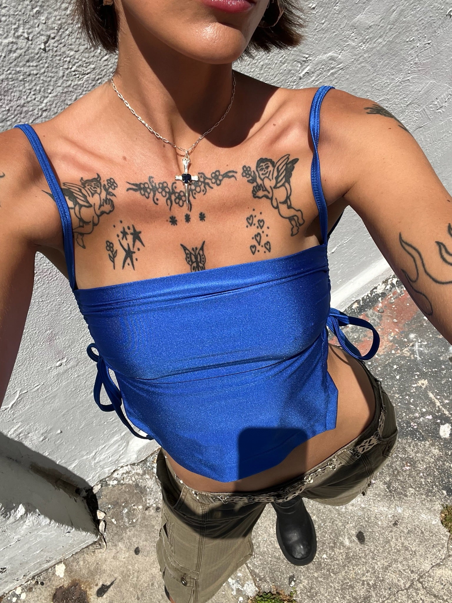 The iconic 2000s style ruched crop features drawstring ruching and can be worn strapless, halter, criss crossed or asymmetrical.
