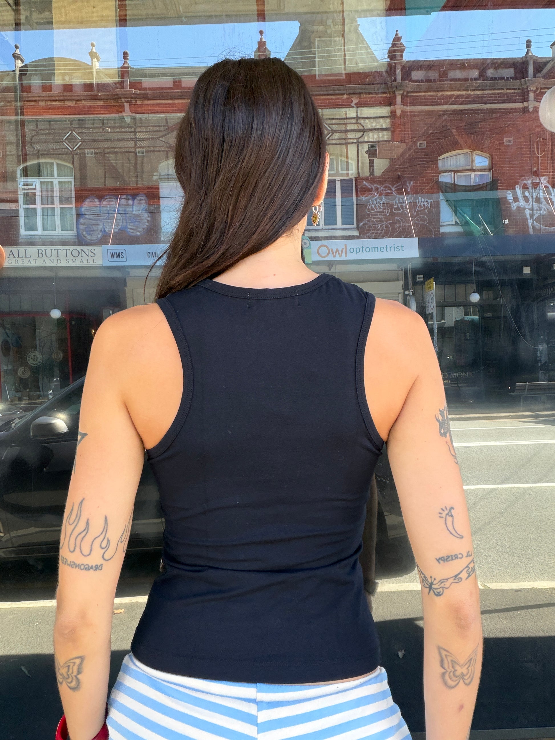 - Black cotton elastane, screen-printed in Melbourne